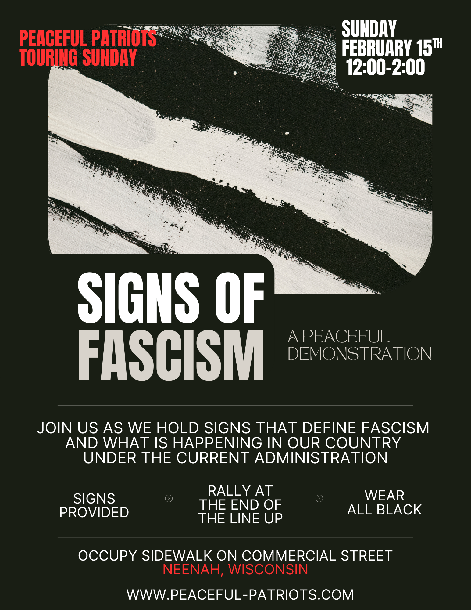 Touring Sunday - Signs of Fascism Sunday, February 15, 2026 12:00 PM 2:00 PM Commercial Street Neenah (map) Google Calendar ICS